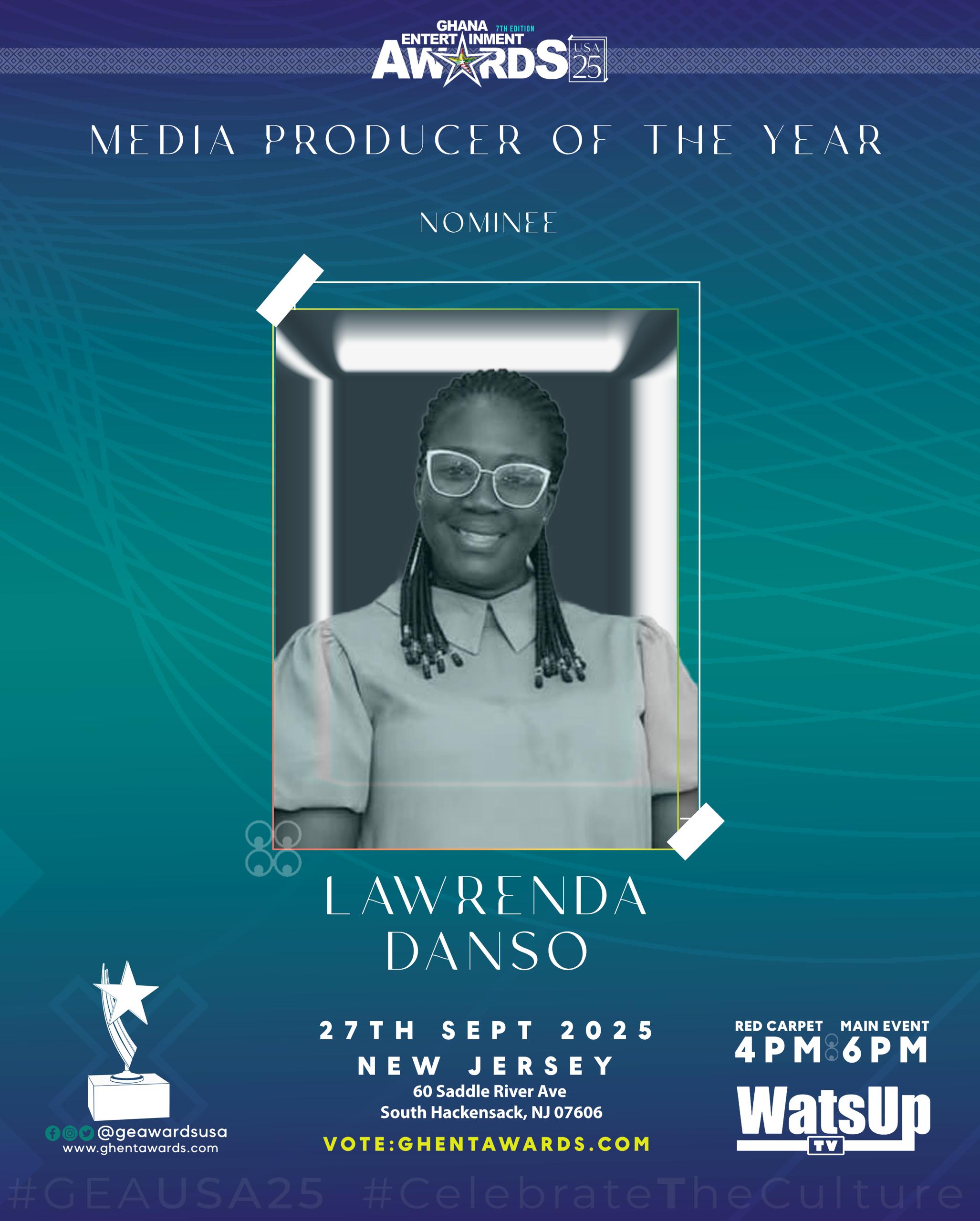 Happy 98.9 FM’s seasoned producer, Lawrenda Danso, has been named “Media Producer of the Year” at the prestigious 2025 Ghana Entertainment Awards USA, cementing her place among the most accomplished media professionals in Ghana.